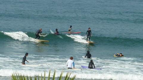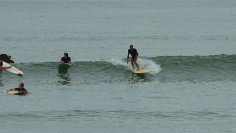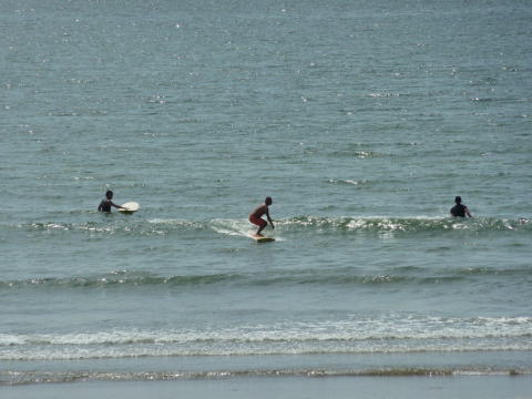 | 昨日の予想で「早い内の1ラウンドを。」と書かれて いたので、5時半にはメイン前駐車場はほぼ満車。 海にも既に70人ほど入ってる。とほほ...だ! でも、「遊べるでー!」と中西さんを起こして入水。 稀に入るいいセットがほとんど取れず、今日はダメ でしたねー。今年2回目で筋力不足に感も戻らずか? |